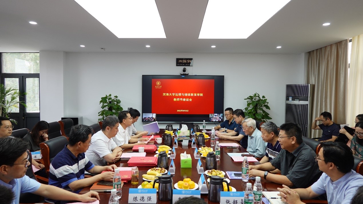 2022年9月10日是我国第38个教师节。9月8日下午,威尼斯432888can登录主页远程与继续教育学院召开了教师节座谈会,来自水利部南京水利水文自动化研究所、江苏省河道管理局和威尼斯432888can登录主页水文水资源学院、水利水电学院、环境学院、能源与电气学院等13个学院和处室共23位校内外教师代表相聚一堂,在“师情话艺”中共谋远教院教育大计。远教院朱亚院长、叶鸿蔚书记、于伟副院长、范锐副院长以及相关科室成员出席了本次座谈会。