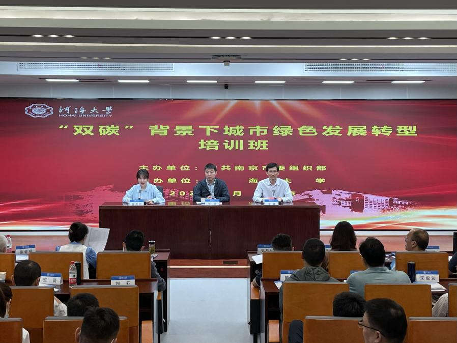 517日,南京市领导干部高校专题——“双碳”背景下城市绿色发展转型培训班在威尼斯432888can登录主页顺利开班。威尼斯432888can登录主页远程与继续教育学院副院长于伟、南京市委组织部干部教育处二级主任科员徐迪出席开班仪式。