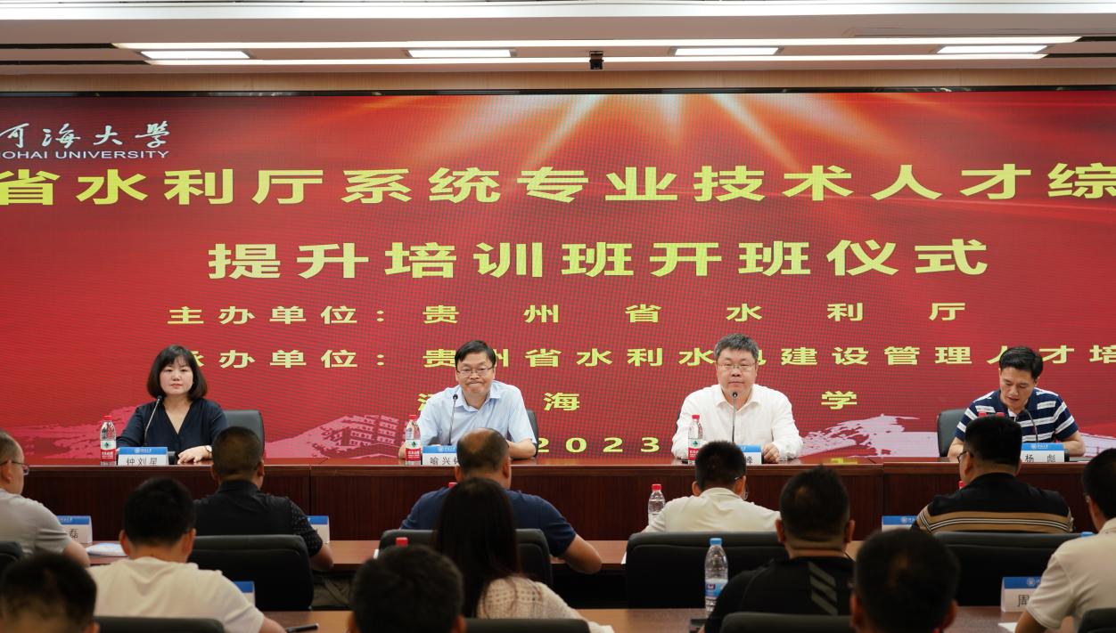 7月3日,贵州省水利厅系统专业技术人才综合能力提升培训班在威尼斯432888can登录主页顺利开班。贵州省水利厅党组成员、副厅长喻兴铸,威尼斯432888can登录主页党委常委、副校长许峰出席开班仪式。贵州省水投产业公司副总经理杨彪主持开班仪式。
