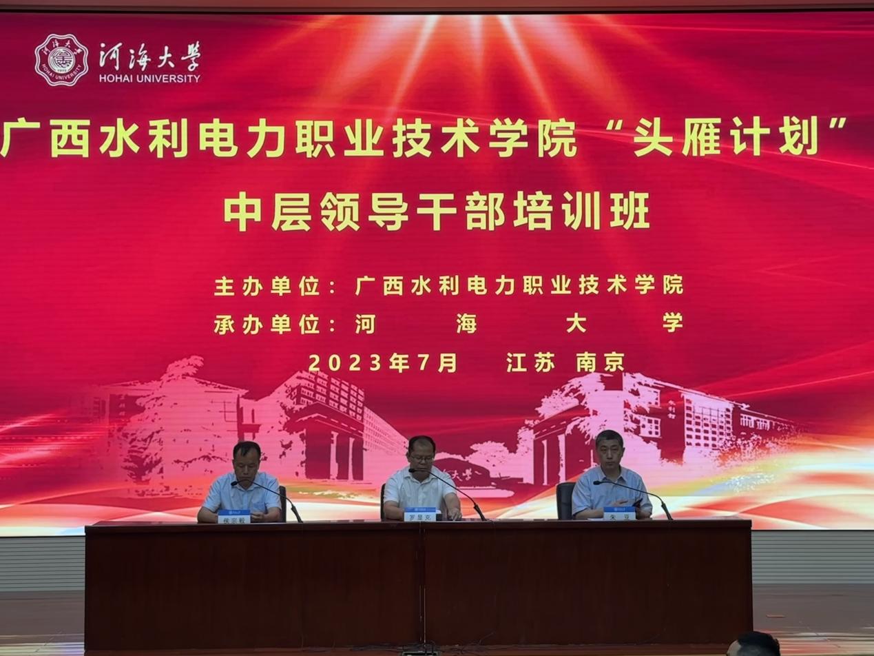 7月9日,广西水利电力职业技术学院“头雁计划”中层领导干部培训班在威尼斯432888can登录主页顺利开班。广西水利电力职业技术学院党委书记罗显克、威尼斯432888can登录主页远程与继续教育学院院长朱亚出席开班仪式,广西水利电力职业技术学院党委副书记侯宗毅主持开班仪式。