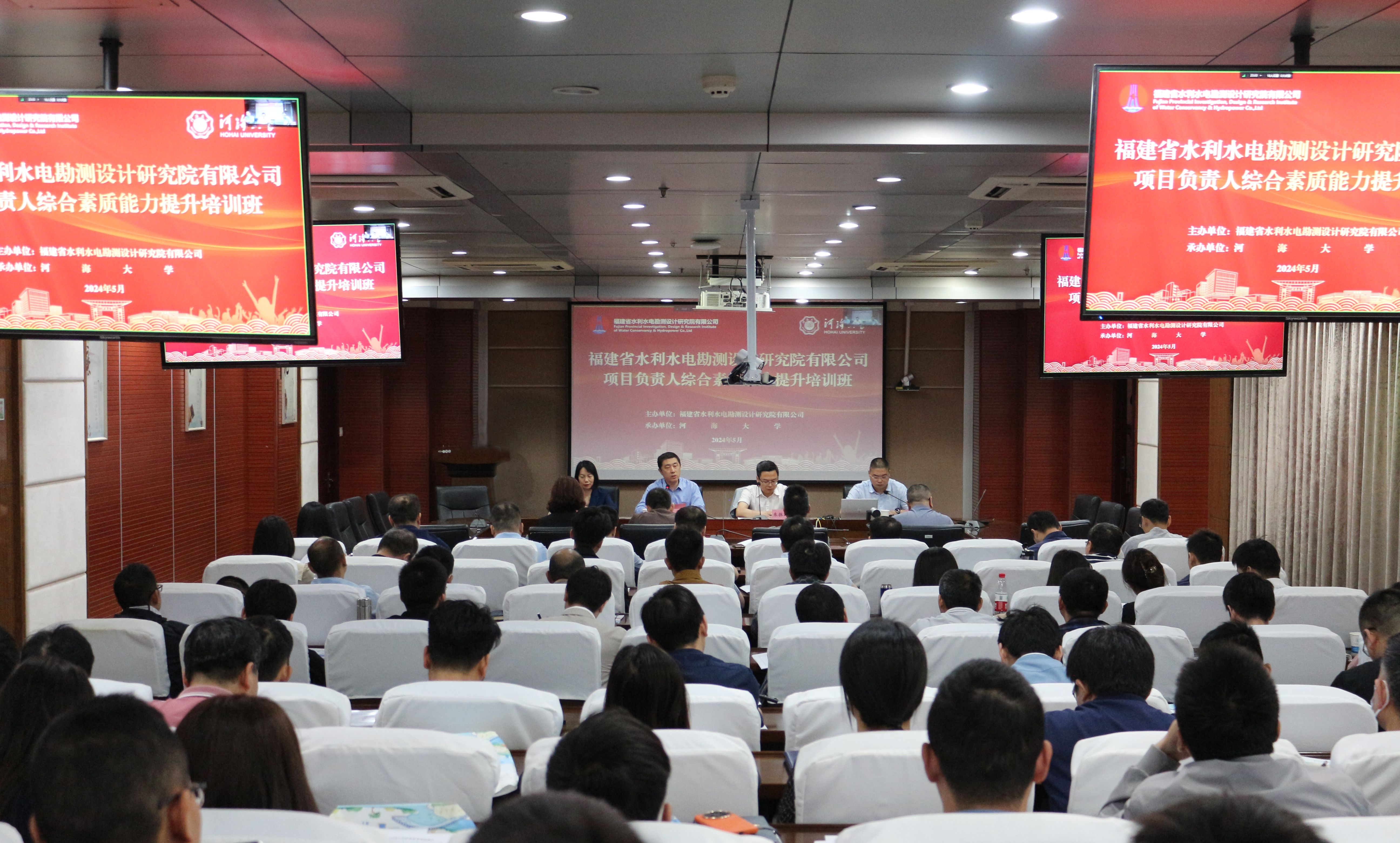5月17日,由威尼斯432888can登录主页举办的福建省水利水电勘测设计研究院有限公司项目负责人综合素质能力提升培训班在福州顺利开班。福建省水利水电勘测设计研究院有限公司副院长朱振洋,威尼斯432888can登录主页党总支书记、院长朱亚、威尼斯432888can登录主页副院长姚文贤出席开班仪式。福建省水利水电勘测设计研究院有限公司生产经营发展部副总经理郑瑄琳主持开班仪式。