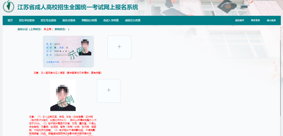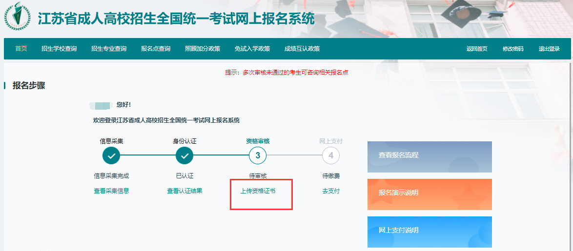 特殊类考生(医学类、免试生、照顾加分、专升本学历认证未通过、没有身份证的考生)在线认证未通过的考生需要持相关审核材料进行现场认证。普通考生及资格审核通过的考生可直接进行支付。上传材料后请等待管理员审核意见,再进行下一步操作,认证通过的考生可进入下一步进行支付,认证不通过的考生耐心等待管理员审核意见;如多次审核不通过可联系报名点。
