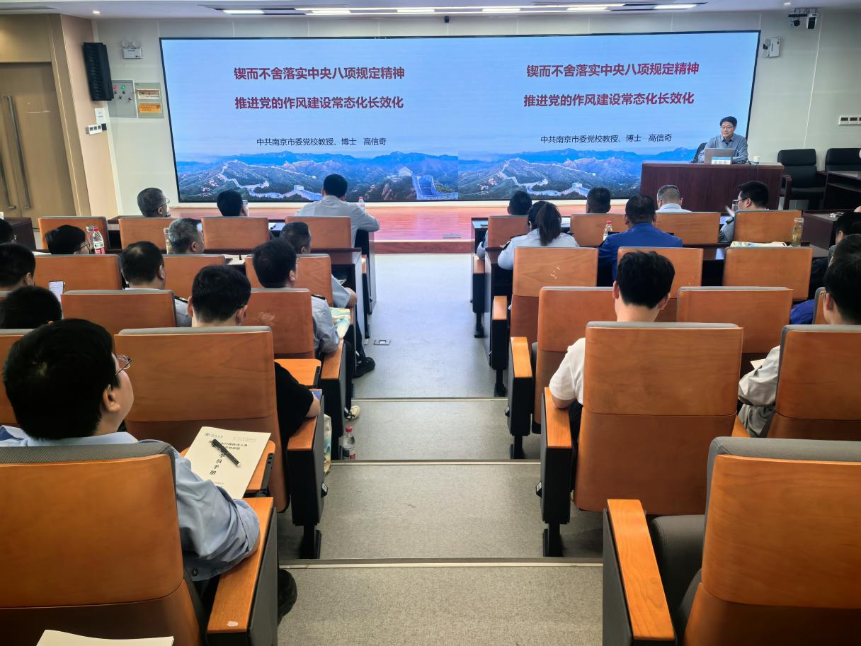 活动特邀南京市委党校教授高信奇授课。高信奇以《锲而不舍落实中央八项规定精神 推进党的作风建设常态化长效化》为题,结合习近平总书记关于加强党的作风建设的重要论述,系统阐释了中央八项规定精神的时代意义和实践要求。他回顾了党的十八大以来,党中央以作风建设为突破口推进全面从严治党的历史进程,强调中央八项规定精神的核心在于密切党同人民群众的血肉联系,夯实党的执政根基。他指出,中央八项规定是新时代全面从严治党的“切入点”和“动员令”,必须常抓不懈、久久为功。针对当前作风建设面临的挑战,高信奇强调,形式主义、官僚主义具有顽固性和反复性,必须坚持问题导向,通过健全制度、强化监督,以常态化监督推动作风建设向纵深发展。