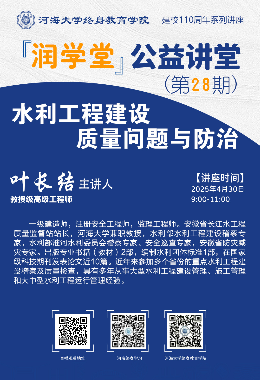 【润学堂】公益讲堂第二十八期:水利工程建设质量问题与防治